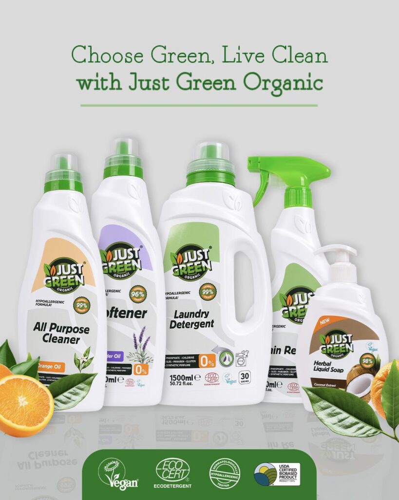 Just Green Organic tooted on valmistatud 100% looduslikest koostisosadest ning sertifitseeritud ECOCERTi, Vegan Society ja USDA poolt, dermatoloogiliselt testitud ja hüpoallergeensed.
